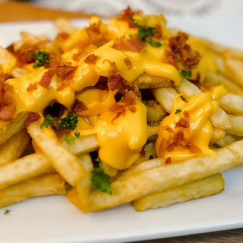 A hearty portion of crispy fries topped with melted cheddar and crispy bacon bits.
